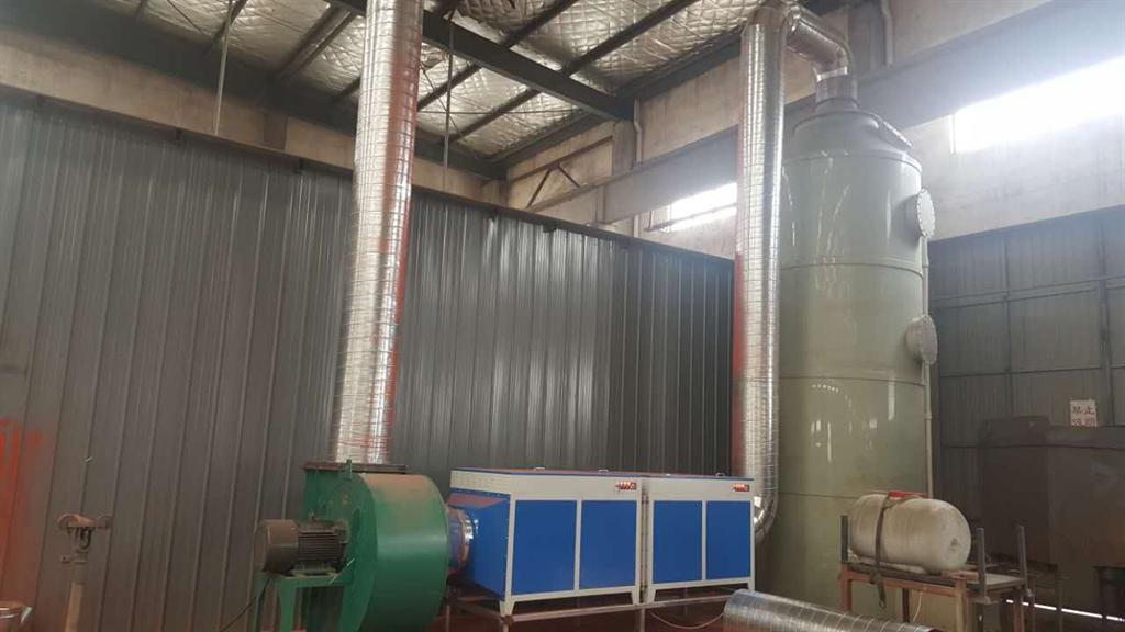 廢氣源集氣罩(搜集車間各個廢氣源的廢氣,接入主管道)噴淋吸收塔(吸收掉能溶于水的無機廢氣、粉塵以及顆粒物,降低廢氣溫度,為等離子提供優(yōu)良的運行環(huán)境)_低溫等離子處理設(shè)備(破壞廢氣分子結(jié)構(gòu),轉(zhuǎn)化為物質(zhì)) 高壓風機(高壓的吸力作用下將風抽出車間)凈化吸收塔(進一步吸收粉塵以及顆粒物以及一些無機氣體,水洗小分子碎片,利于檢測達標)煙囪高空排放(也可低空排放)。